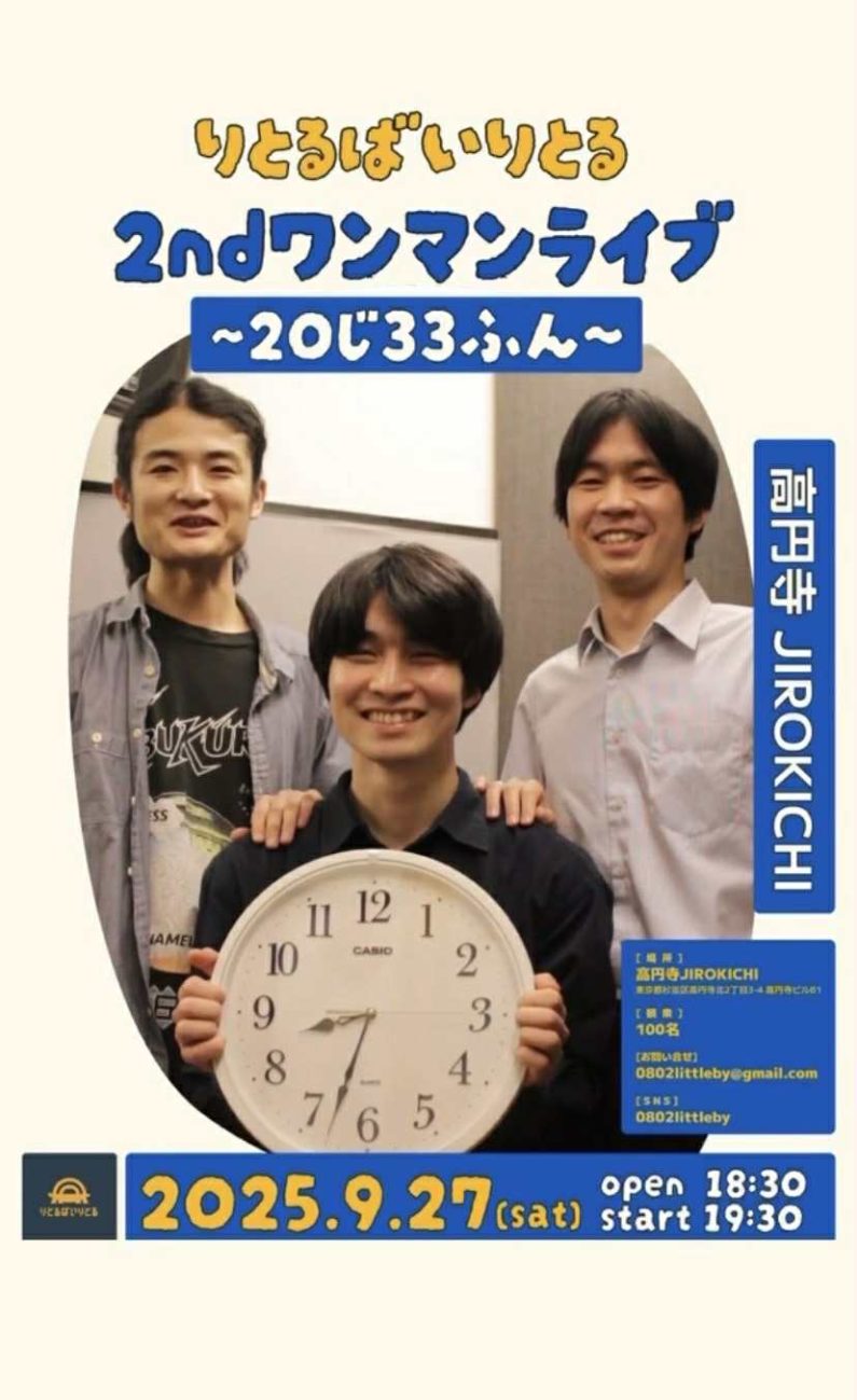 9月27日(土)りとるばいりとる 2ndワンマンライブ 〜20じ33ふん〜 前売(♪2500)当日(♪3000) 2025年9月27日 渡部駿介vo,g トミーかんとく のだけん Open 18:30 Start 19:30 Charge+1drink order ご予約・お問い合わせ⇒ 0802littleby@gmail.com Tweet : 2025年9月