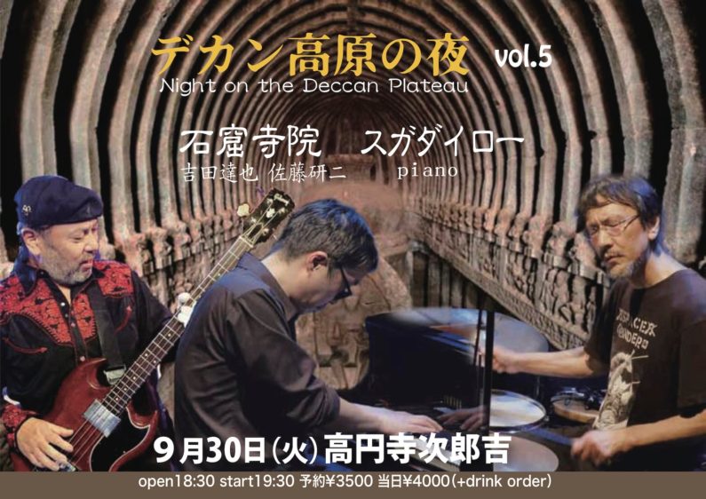 9月30日(火)デカン高原の夜 vol.5 石窟寺院+スガダイロー 予約(♪3500)当日(♪4000) 2025年9月30日 【石窟寺院】吉田達也dr 佐藤研二b +スガダイローpf Open 18:30 Start 19:30 Charge+1drink order ●9/2(火)19時よりSTAGLEEにて前売受付 ※整理番号発行/整理番号順の入場で自由席となります Tweet : 2025年9月