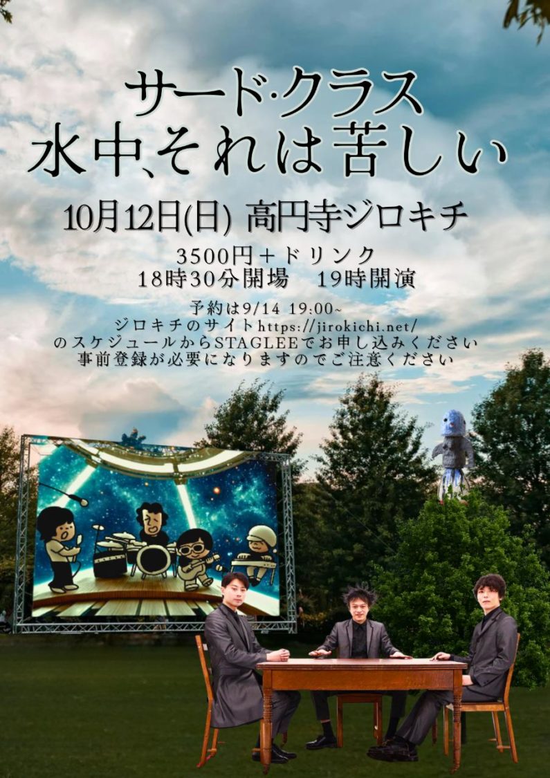 10月12日 (日) サード・クラス -水中、それは苦しい- 予約(♪3500)当日(♪4000) 2025年10月12日 サード・クラス Open 18:30 Start 19:00 Charge+1drink order ●10/14(日)19時よりSTAGLEEにて予約受付 ※整理番号発行/整理番号順の入場で自由席となります Tweet : 2025年10月