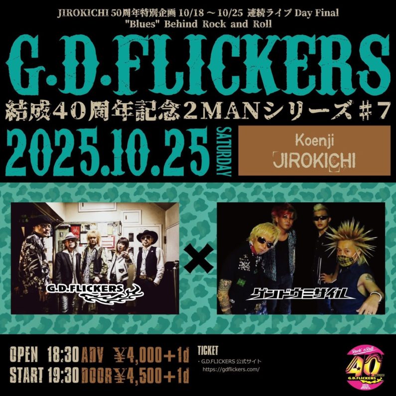 10月25日(土)【JIROKICHI50周年特別企画 “Blues” Behind Rock and Roll】day8 – G.D.FLICKERS結成40周年記念2MANシリーズ#7 予約(♪4000)当日(♪4500) 2025年10月25日 G.D.FLICKERS (※サポートドラマーKAZI)/ゲンドウミサイル Open 18:30 Start 19:30 Charge+1drink order ご予約受付→ http://gdflickers.com/ Tweet : 2025年10月