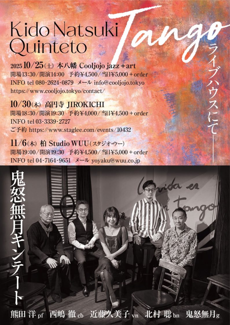 10月30日 (木)鬼怒無月キンテート 予約(♪4500)当日(♪5000) 2025年10月30日 鬼怒無月g 北村聡bn 近藤久美子vln 熊田洋pf 西嶋徹cb Open 18:30 Start 19:30 Charge+1drink order ●10/2(木)19時よりSTAGLEEにて予約受付 ※整理番号発行/整理番号順の入場で自由席となります Tweet : 2025年10月