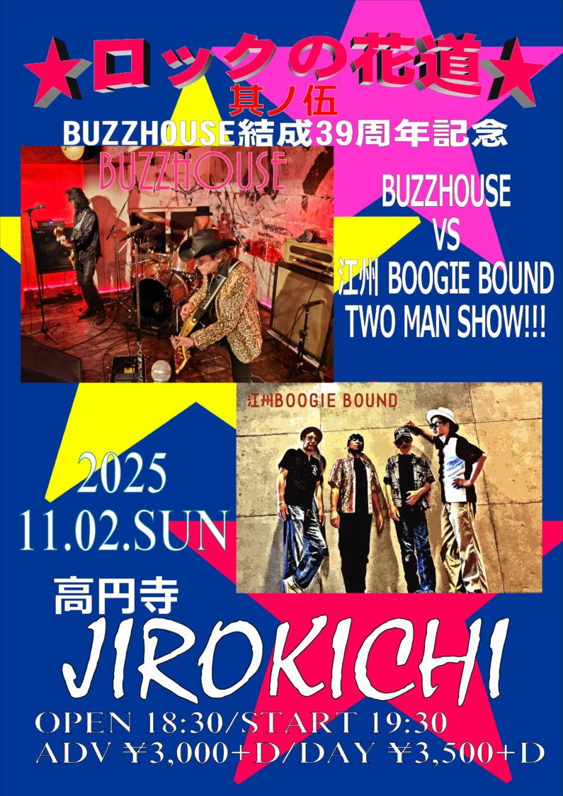 11月2日(日)『ロックの花道』其の伍 BUZZHOUSE結成39周年記念祭! 予約(♪3000)当日(♪3500) 2025年11月2日 【BUZZHOUSE】エノヤンvo,g 本多智郎b,cho 藤森直之dr,cho/ 【江州BOOGIE BOUND】key-tone(vo,g) A-boom(b,cho) m.m.yossy(dr,cho) Open 18:30 Start 19:30 Charge+1drink order ●10/5(日)19時よりSTAGLEEにて予約受付 ※整理番号発行/整理番号順の入場で自由席となります Tweet : 2025年11月