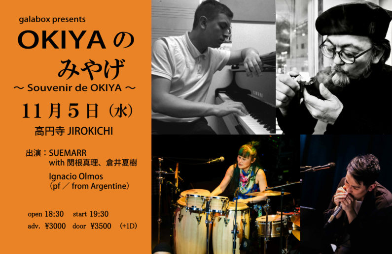 11月5日(水)OKIYAのみやげ 予約(♪3000)当日(♪3500) 2025年11月5日 SUEMARR(vo,g) 関根真理perc 倉井夏樹harp OlmosIgnacio(pf) from Argentine Open 18:30 Start 19:30 Charge+1drink order ●10/8(水)19時よりSTAGLEEにて予約受付 ※整理番号発行/整理番号順の入場で自由席となります Tweet : 2025年11月
