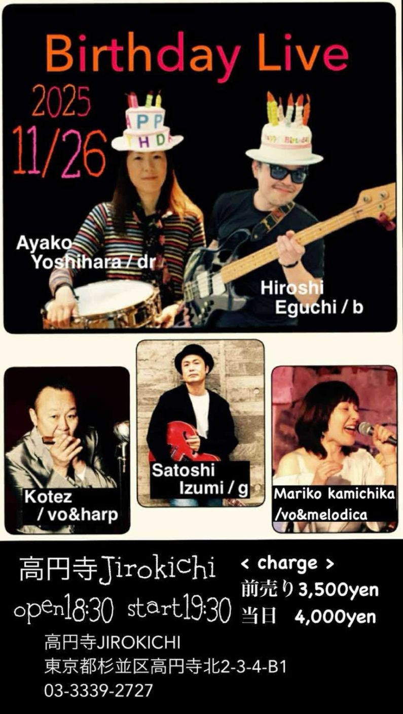 11月26日(水)江口弘史&吉原あやこBirthday Live 予約(♪3500)当日(♪4000) 2025年11月26日 吉原あやこdr 江口弘史b Kotez(vo,harp) 神近まりこvo 和泉聡志g Open 18:30 Start 19:30 Charge+1drink order ●10/29(水)19時よりSTAGLEEにて予約受付 ※整理番号発行/整理番号順の入場で自由席となります Tweet : 2025年11月