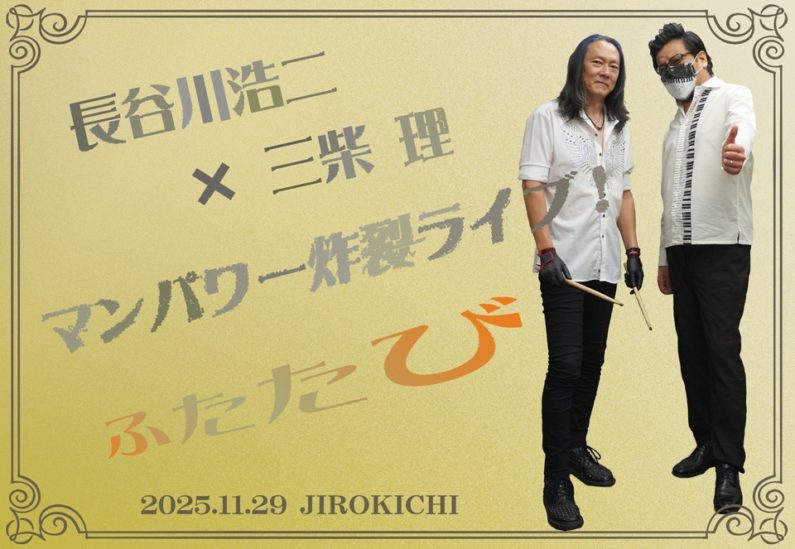 ◆SOLD OUT◆ 11月29日(土)「マンパワー炸裂ライブ!ふたたび」前売(♪5500)当日(♪6000) 2025年11月29日 前売券定数に達したため販売を締め切りました。当日券の販売予定はございません。 長谷川浩二dr 三柴理pf Open 18:30 Start 19:30 Charge+1drink order ●7/27(日)19時よりLivePocketにて前売受付 ※整理番号発行/整理番号順の入場で自由席となります Tweet : 2025年11月
