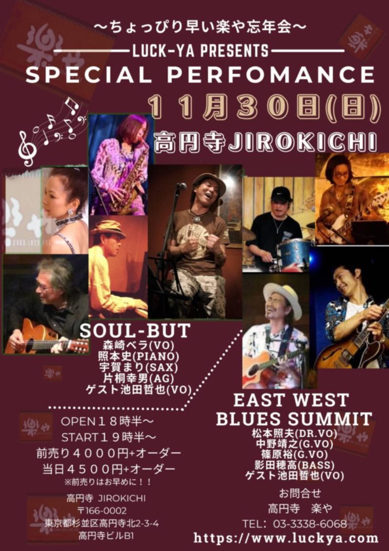 11月30日(日)高円寺楽やPRESENTS ちょっぴり早い楽や忘年会 予約(♪4000)当日(♪4500) 2025年11月30日 【SOUL-BUT】森崎ベラvo 照本史pf,vo 宇賀まりsax 片桐幸男g <ゲスト>池田哲也vo/ 【EAST WEST BLUES SUMMIT】松本照夫dr,vo 中野靖之g,vo 篠原裕g,vo 影田穂高b <ゲスト>池田哲也vo Open 18:30 Start 19:30 Charge+1drink order ●11/2(日)19時よりSTAGLEEにて予約受付 ※整理番号発行/整理番号順の入場で自由席となります Tweet : 2025年11月