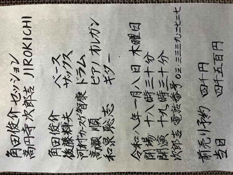 1月8日(木)角田俊介セッション 予約(♪4000)当日(♪4500) 2026年1月8日 角田俊介b 後藤輝夫sax 河村カースケ智康dr 高瀬順pf,org 和泉聡志g Open 18:30 Start 19:30 Charge+1drink order ●12/11(木)19時よりSTAGLEEにて予約受付 ※整理番号発行/整理番号順の入場で自由席となります Tweet : 2026年1月