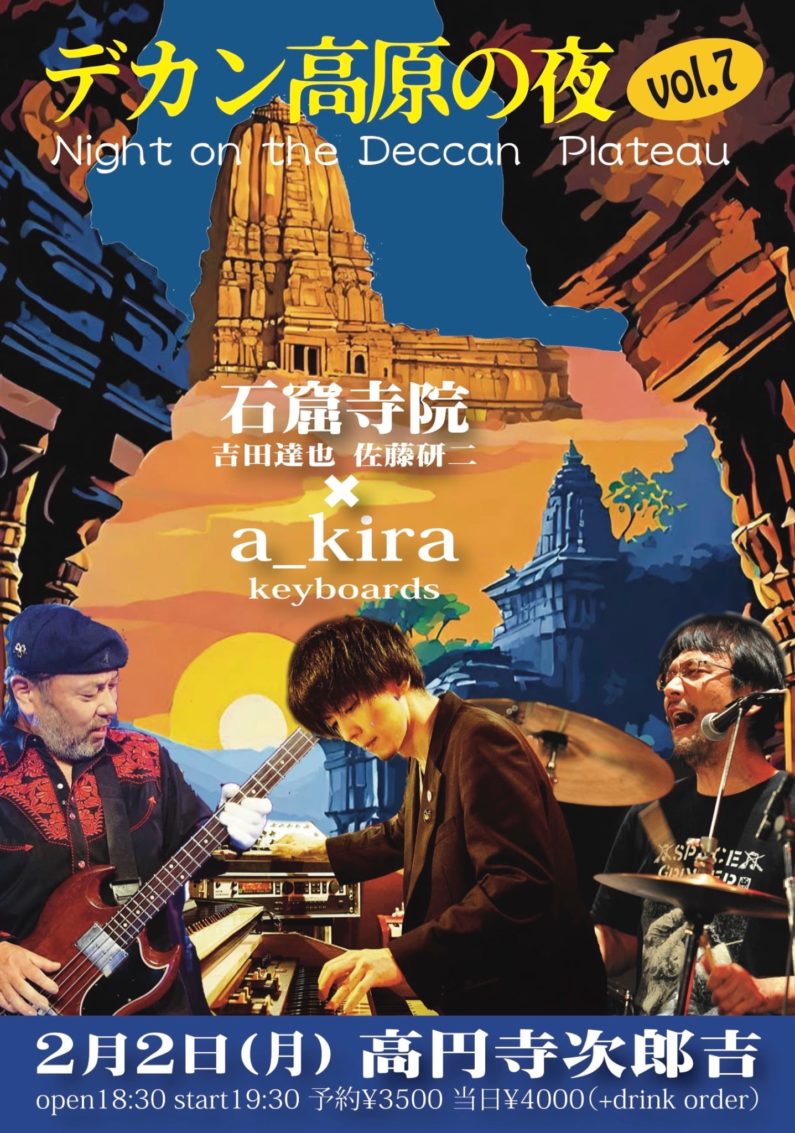 2月2日(月)デカン高原の夜 vol.7 予約(♪3500)当日(♪4000) 2026年2月2日 【石窟寺院】吉田達也dr 佐藤研二b <ゲスト>a_kira (key)from 曇ヶ原 Open 18:30 Start 19:30 Charge+1drink order ●1/5(月)19時よりSTAGLEEにて予約受付 ※整理番号発行/整理番号順の入場で自由席となります Tweet : 2026年2月