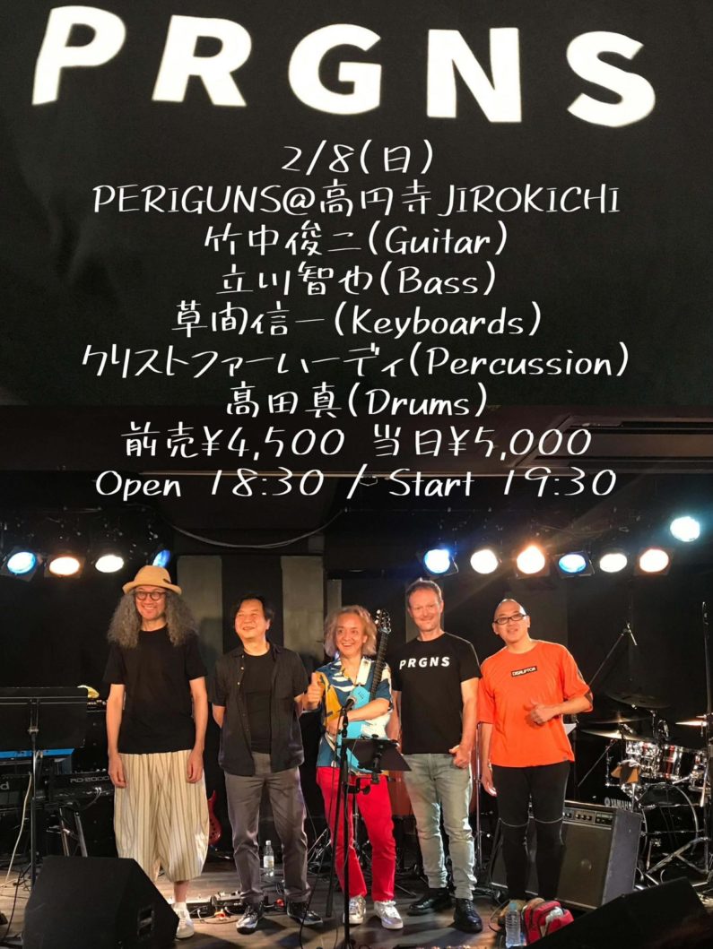 2月8日(日)PERIGUNS 予約(♪4500)当日(♪5000) 2026年2月8日 竹中俊二g 立川智也b 草間信一key クリストファーハーディperc 髙田真dr Open 18:30 Start 19:30 Charge+1drink order ●1/11(日)19時よりSTAGLEEにて予約受付 ※整理番号発行/整理番号順の入場で自由席となります Tweet : 2026年2月
