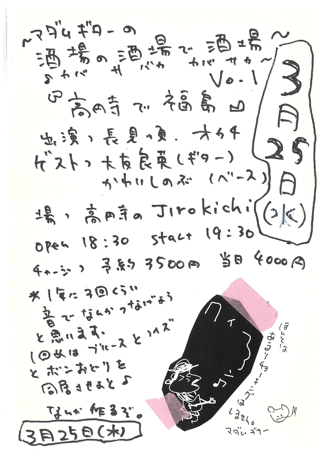 25 3月 2026 3月25日(水)「マダムギターの酒場の酒場で酒場Vol.1 高円寺で福島。」 予約(♪3500)当日(♪4000) マダムギター長見順vo,g,pf 岡地曙裕dr <ゲスト>大友良英g かわいしのぶb Open 18:30 Start 19:30 Charge+1drink order ●2/25(水)19時よりSTAG …