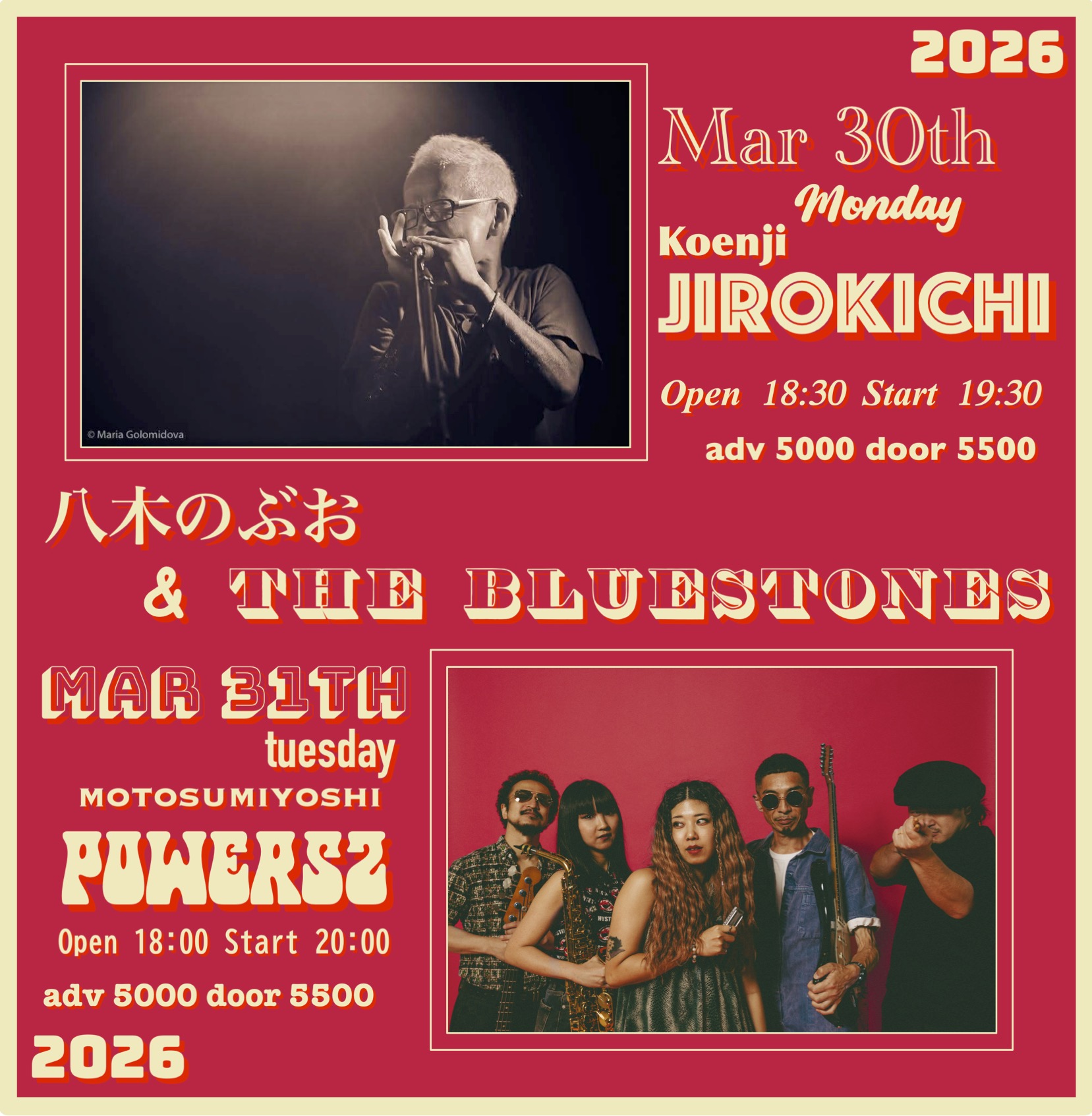 30 3月 2026 3月30日(月)八木のぶお & The Bluestones 予約(♪5000)当日(♪5500) 八木のぶおvo,harp 大久保紅葉vo,harp 竹内朋康g 前田サラsax 大神田智彦b 白根佳尚dr Open 18:30 Start 19:30 Charge+1drink order ●3/2(月 …