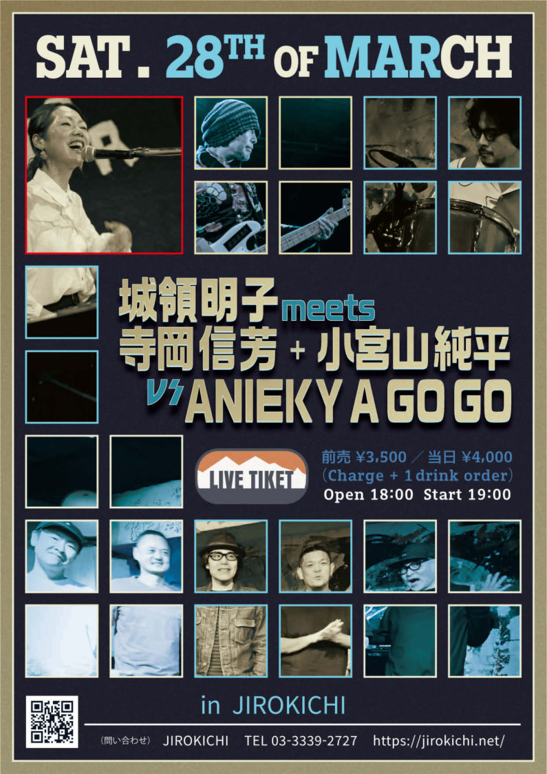 3月28日(土)城領明子トリオ/ANIEKY A GO GO ! 予約(♪3500)当日(♪4000) 2026年3月28日 【ANIEKY A GO GO BAND】アニーキーアゴーゴー!pf,vo 松平賢一g 山本直哉b 麻生祥一郎dr 加藤雄一郎sax/ 【城領明子トリオ】城領明子vo,pf 寺岡信芳b 小宮山純平dr Open 18:00 Start 19:00 Charge+1drink order ●2/28(土)19時よりSTAGLEEにて予約受付 ※整理番号発行/整理番号順の入場で自由席となります Tweet : 2026年3月