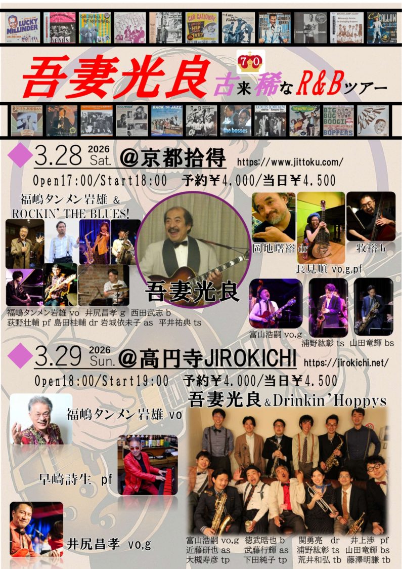 なんだよツアーて言っても2日じゃねえか!とお叱りの言葉をいただきそうですが、高齢化が進む日本社会ですから、これくらいがちょうど良いという考え方もあります(笑)ということで、ツアーファイナルとなるJIROKICHIで、日本ブルース界の至宝と云われる吾妻光良氏の古希を是非みんなでお祝いしましょう?皆様のお越しを心よりお待ちしております。