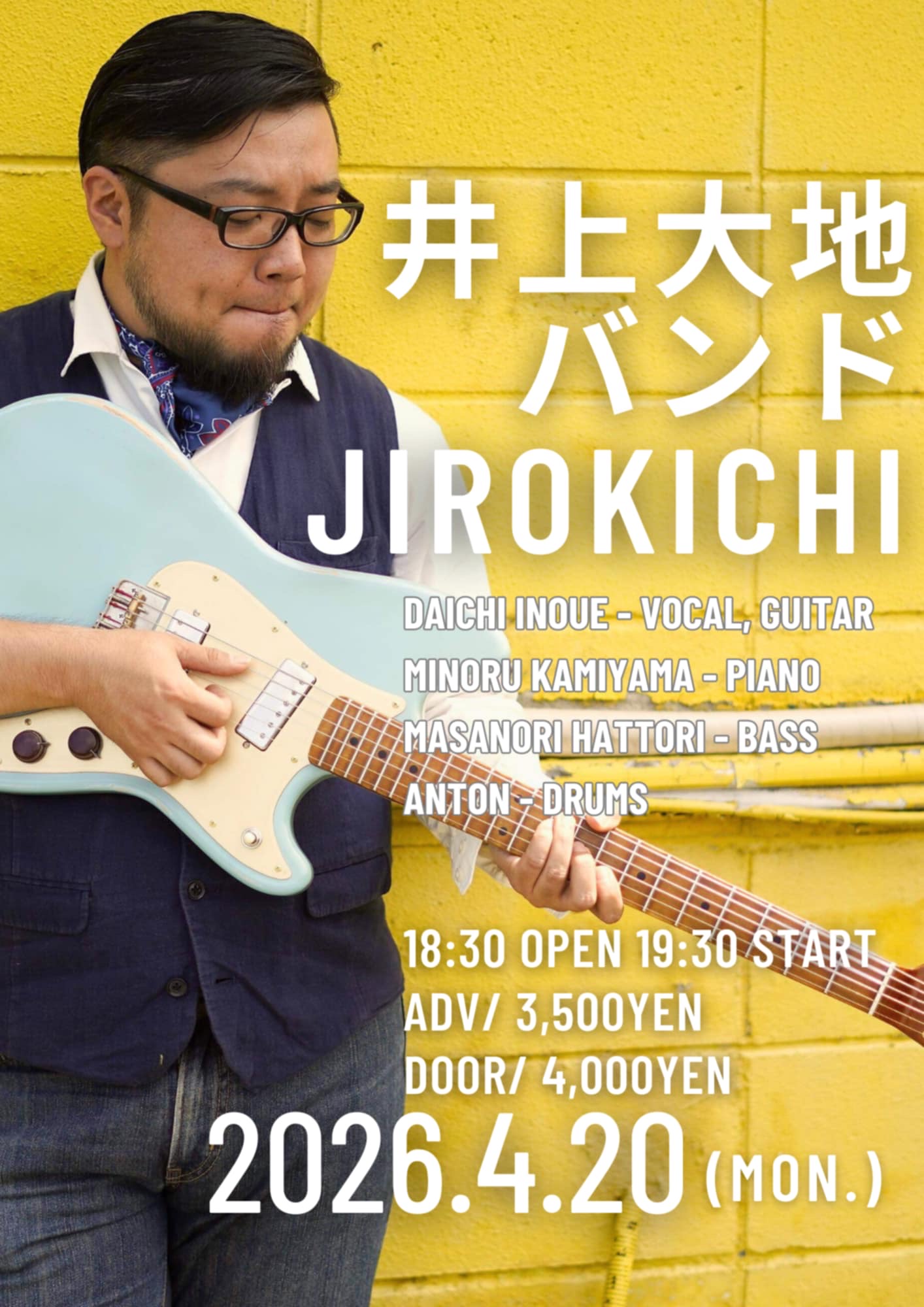 20 4月 2026 4月20日(月)井上大地バンド予約(♪3500)当日(♪4000) 井上大地vo,g 上山実pf 服部将典b アントンdr Open 18:30 Start 19:30 Charge+1drink order ●12/15(月)19時よりSTAGLEEにて予約受付 ※整理番 …