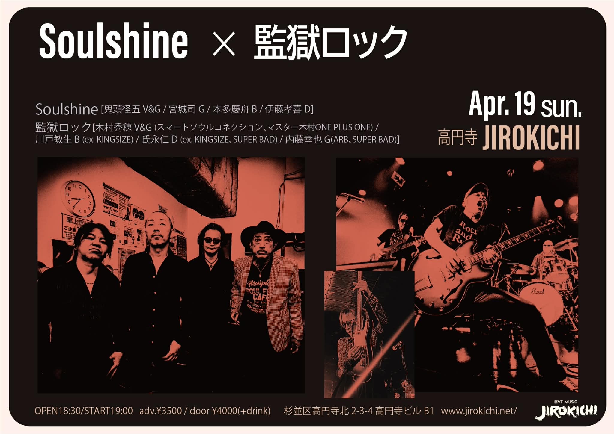 19 4月 2026 4月19日(日)Soulshine×監獄ロック 予約(♪3500)当日(♪4000) 【Soulshine】鬼頭径五vo,g 宮城司g 本多慶舟b 伊藤孝喜dr/ 【監獄ロック】木村秀穂vo,g (スマートソウルコネクション、マスター木村ONE PLUS ONE) 川戸敏生b(ex KINGSIZE) 氏 …