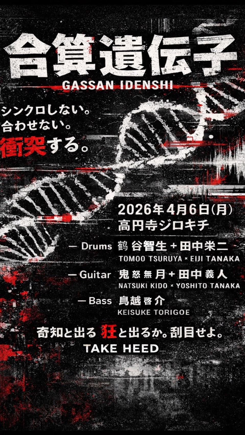 6 4月 2026 4月6日(月)合算遺伝子 予約(♪4000) 当日(♪4500) 鶴谷智生dr 田中栄二dr 鬼怒無月g 田中義人 鳥越啓介b Open 18:30 Start 19:30 Charge+1drink order ●3/9(月)19時よりSTAGLEEにて予約受付 ※整理番号発行/ …