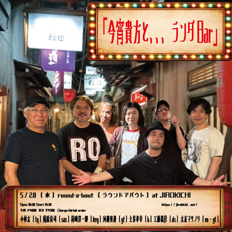 5月20日(水)round-a-bout(ラウンドアバウト) 「今宵貴方と、、、ランダBar🍸」 予約(♪4000)当日(♪4500) 2026年5月20日 小林太tp 庵原良司sax 柿崎洋一郎key 河越重義g 土井孝幸b 工藤恭彦dr 大友マサノリvo,g Open 18:30 Start 19:30 Charge+1drink order ●4/22(水)19時よりSTAGLEEにて予約受付 ※整理番号発行/整理番号順の入場で自由席となります Tweet : 2026年5月