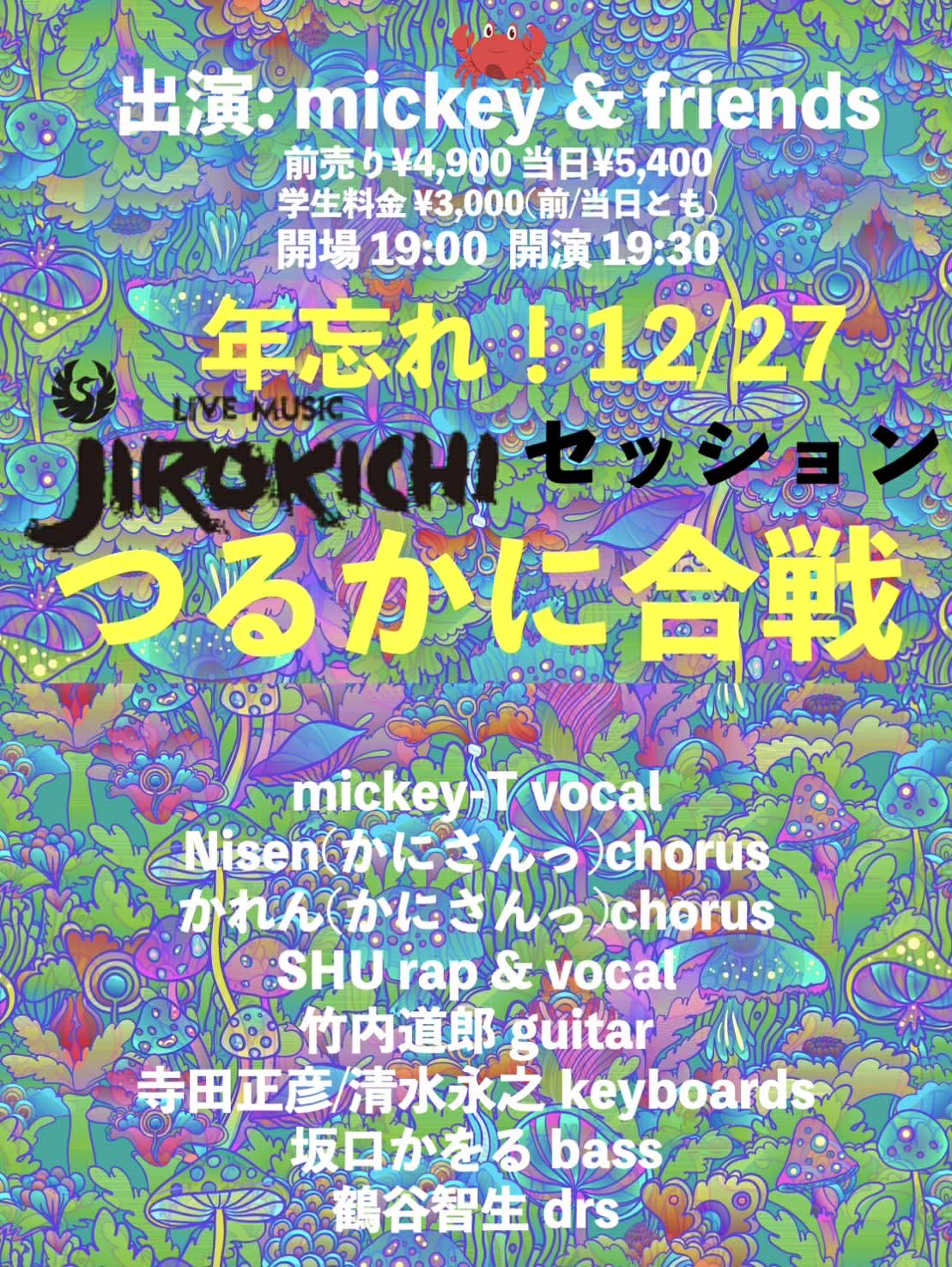 27 12月 2025 12月27日(土)mickey & friends「年忘れ!ジロキチ・セッション -つるかに合戦」 予約(♪4900)当日(♪5400)学生(♪3000) mickey-T(vo) Nisen(かにさんっ)cho かれん(かにさんっ)cho SHU(rap&vo) 竹内道郎g 寺田正彦key 清水永之key 坂口かをるb 鶴谷智生dr Open 19 …