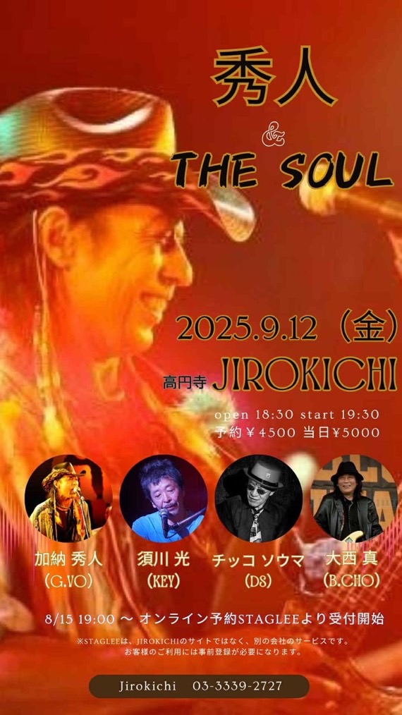 12 9月 2025 9月12日(金)秀人&The Soul 予約(♪4500)当日(♪5000) 加納秀人g,vo 須川光key 大西真b,cho チッコソウマdr,vo Open 18:30 Start 19:30 Charge+1drink order ●8/15(金)19時よりSTA …