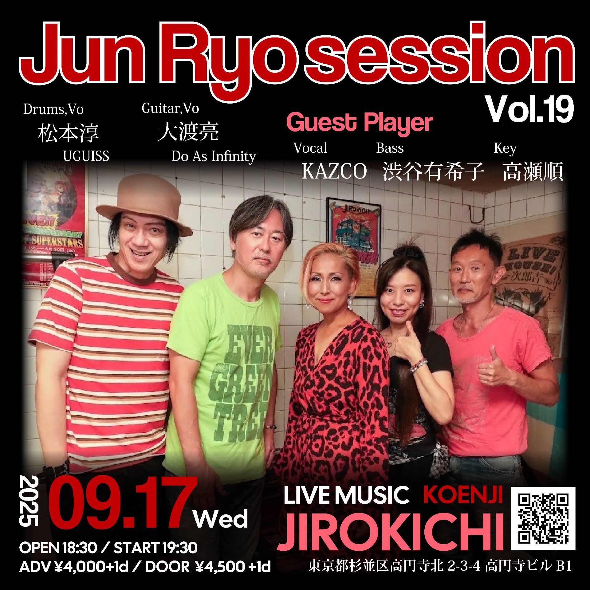 17 9月 2025 9月17日(水)Jun Ryo Session 19 予約(♪4000)当日(♪4500) 大渡亮g,vo 松本淳dr,vo 高瀬順key Kazco(vo) 渋谷ゆきこb,vo Open 18:30 Start 19:30 Charge+1drink order ●8/20(水)1 …