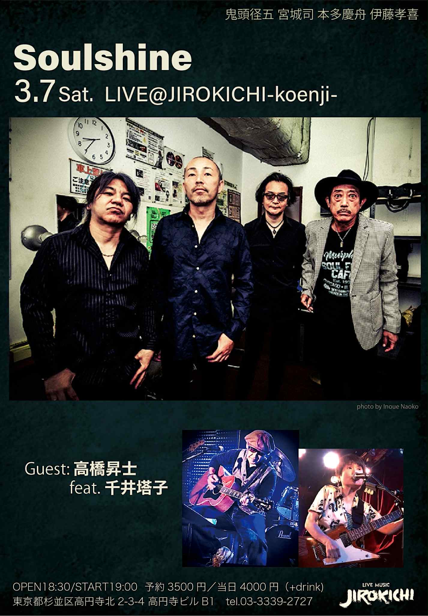 7 3月 2026 3月7日(土)Soulshine <ゲスト>高橋昇士 feat.千井塔子 予約(♪3500)当日(♪4000) 【Soulshine】鬼頭径五vo,g 宮城司g 本多慶舟b 伊藤孝喜dr <ゲスト>高橋昇士 vo,g 千井塔子g,vo Open 18:30 Start 19:00 Charge+1drink order   …