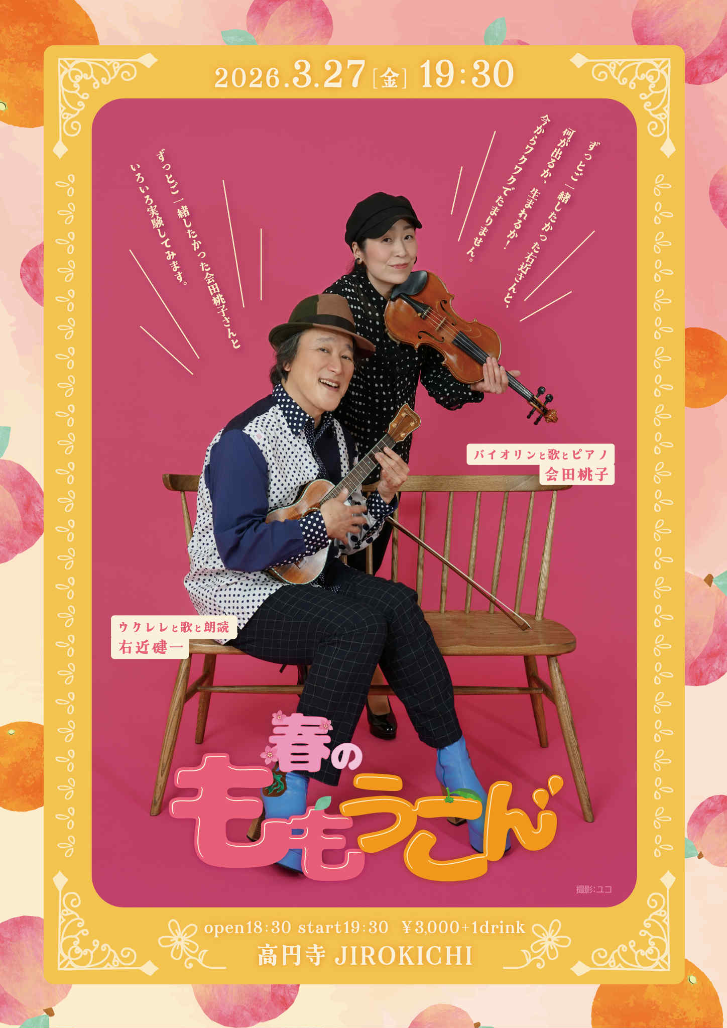 27 3月 2026 3月27日(金)春のももうこん 予約・当日共(♪3000) 会田桃子(バイオリンと歌とピアノ) 右近健一(ウクレレと歌と朗読) Open 18:30 Start 19:30 Charge+1drink order ●2/5(木)19時よりSTGLEEにて予約受付 ※ …