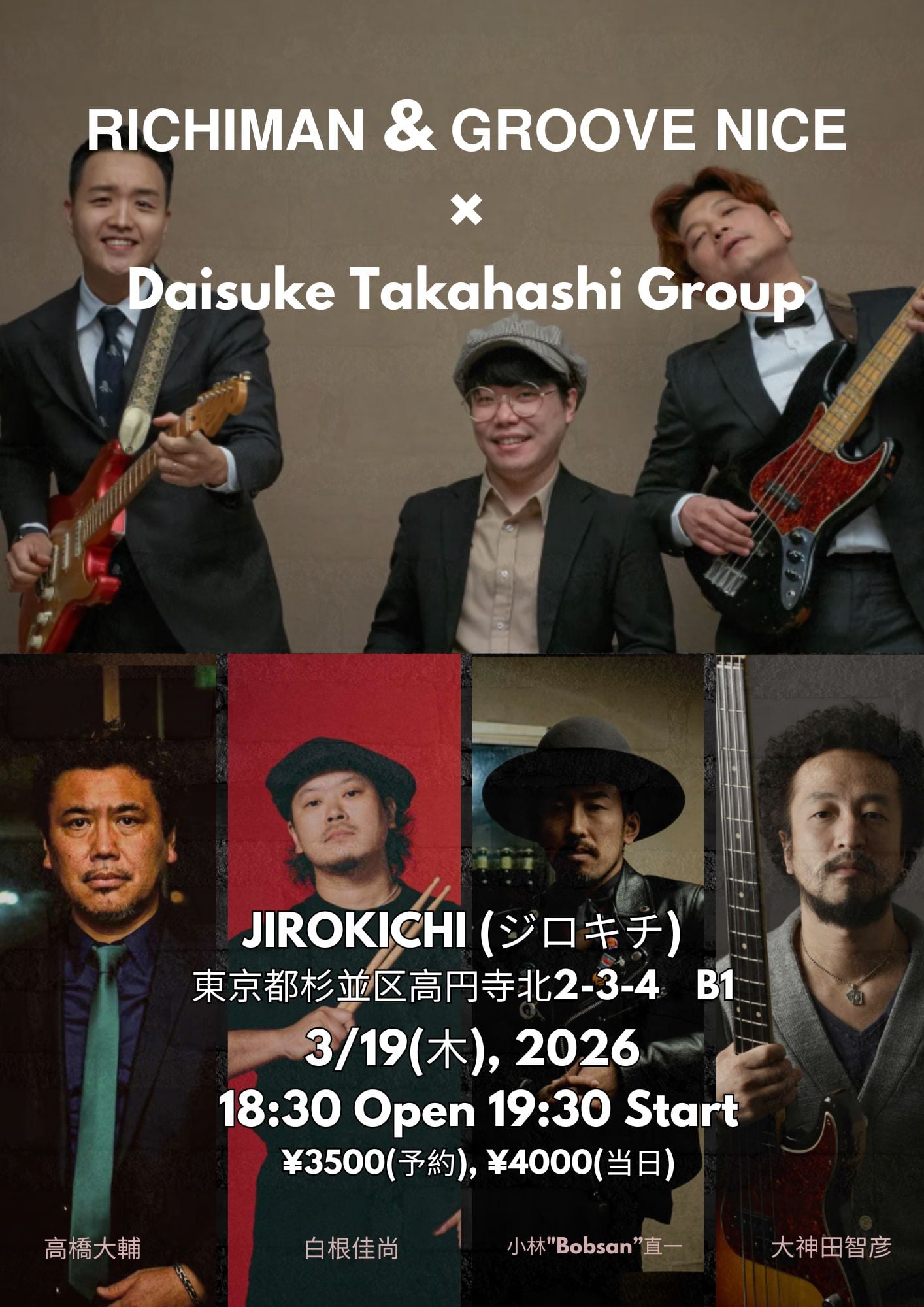 19 3月 2026 3月19日(木)RICHIMAN & GROOVE NICE×Daisuke Takahashi Group 予約(♪3500)当日(♪4000) 【RICHIMAN & GROOVE NICE】/ 【Daisuke Takahashi Group】高橋大輔vo,g 白根佳尚dr 小林“Bobsan”直一g 大神田智彦b Open 18:30 Start 1 …
