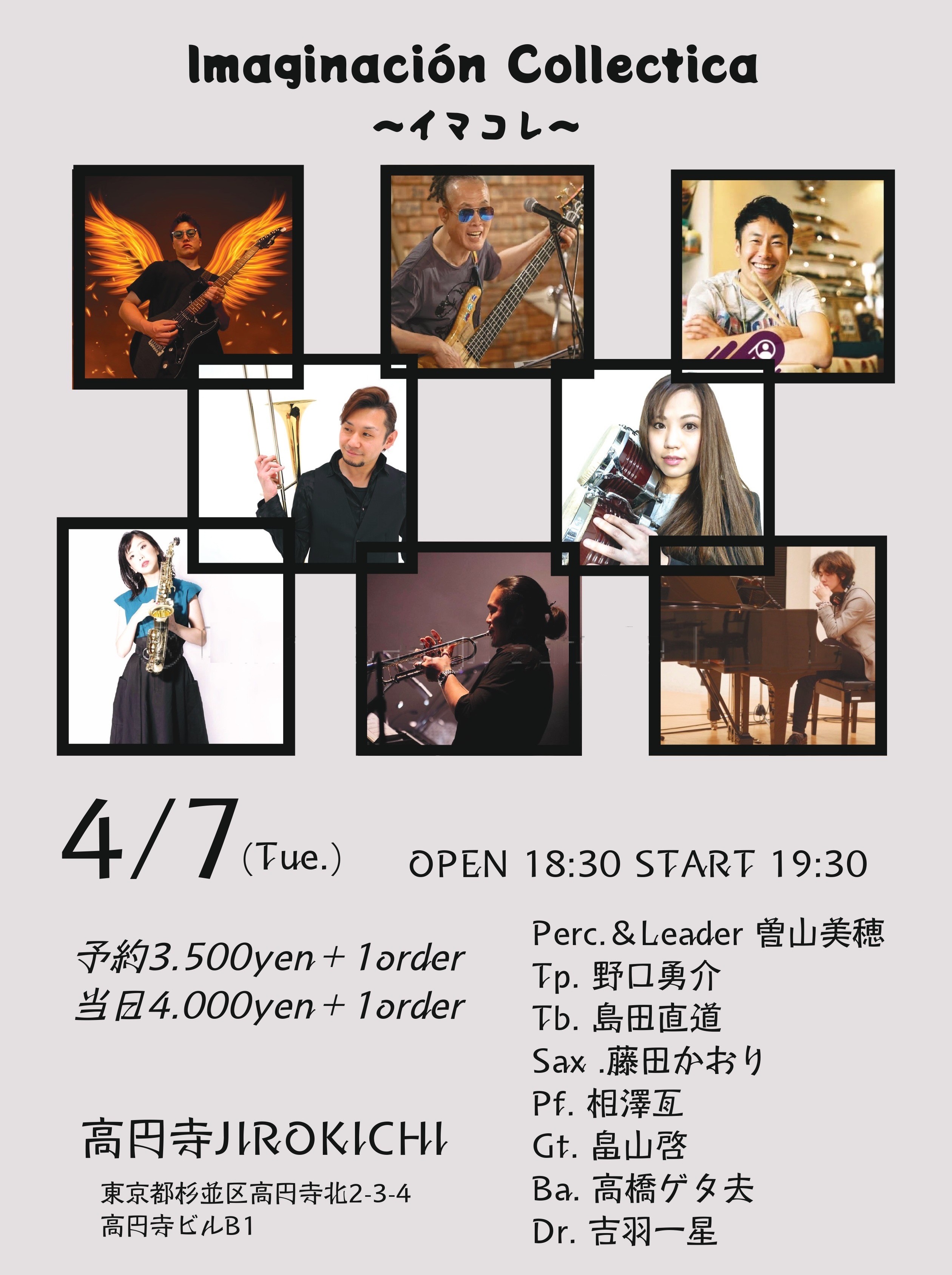 7 4月 2026 4月7日(火)Imaginación Collectica Live 予約(♪3500)当日(♪4000) 曽山美穂perc 野口勇介tp 藤田かおりts 島田直道tb 相澤亙pf 畠山啓g 高橋ゲタ夫b 吉羽一星dr Open 18:30 Start 19:30 Charge+1drink order ●3/1 …